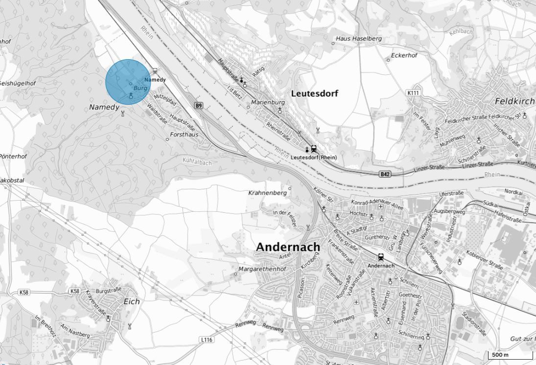 Am 16. Oktober 2025 von 08:00 Uhr (MESZ) bis 16:30 Uhr (MESZ) ist der Drohnenbetrieb wegen eines polizeilichen Einsatzes nordwestlich von Andernach eingeschränkt. In diesem Gebiet gelten die Vorgaben für geografische Gebiete gemäß § 21h Absatz 3 Nummer 11 Luftverkehrs-Ordnung.